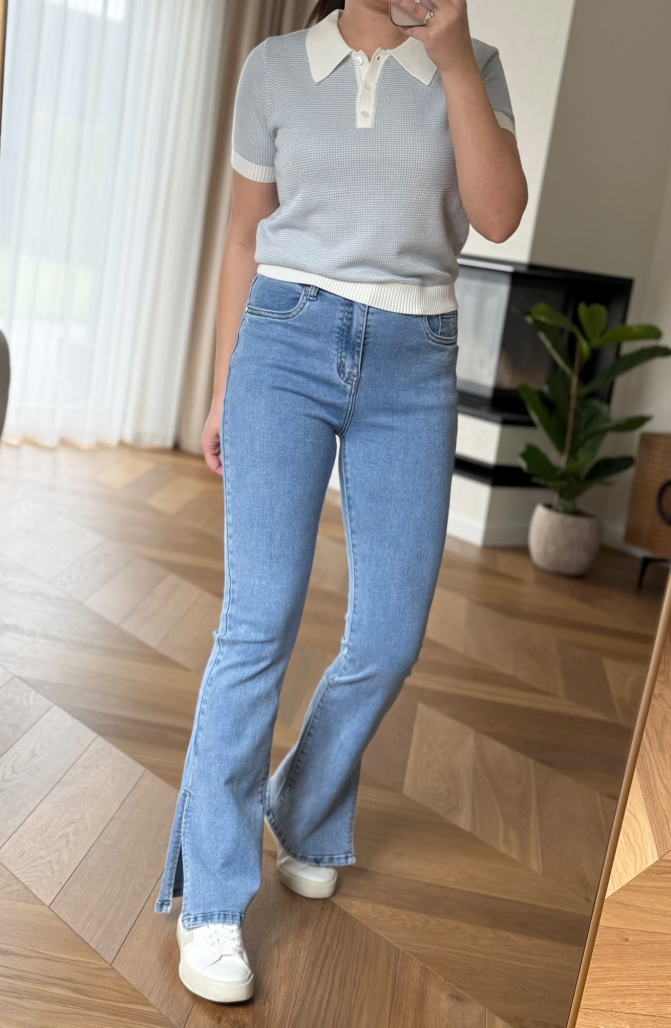Flare stiliaus džinsai su skeltuku